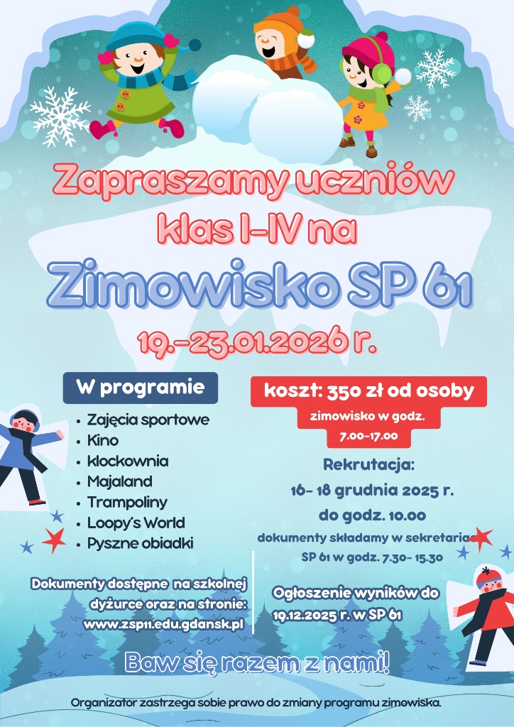 Szczegółowe informacje dotyczące organizacji zimowiska, zasad uczestnictwa oraz wymaganych dokumentów znajdują się w regulaminie oraz na plakacie informacyjnym.